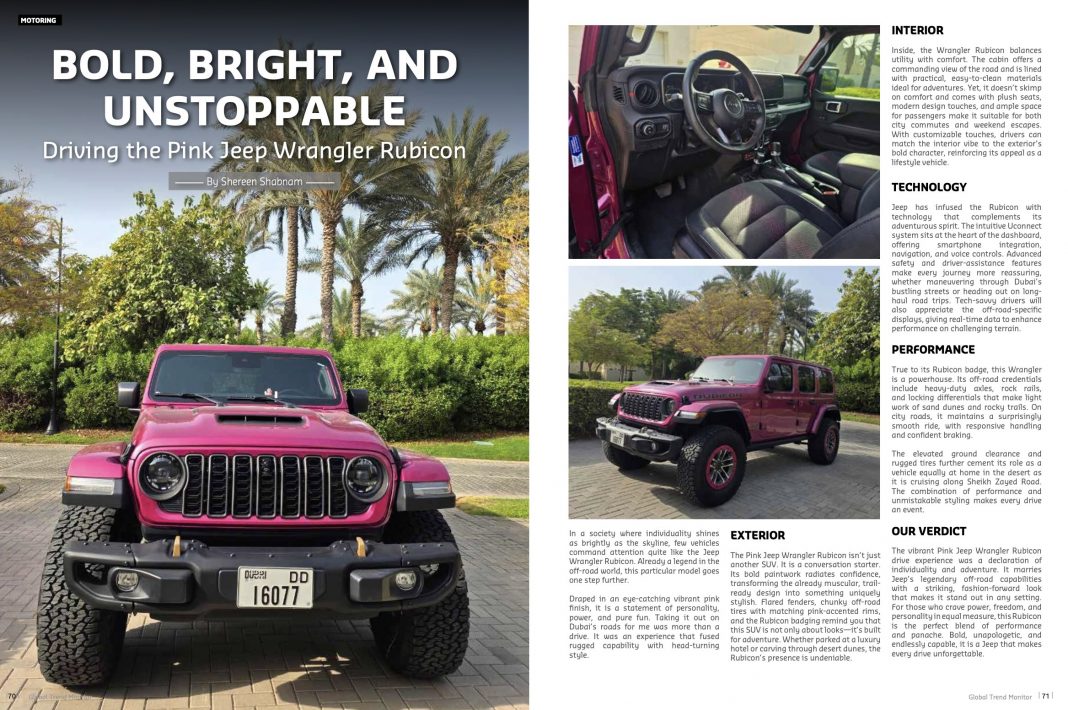 Motoring Bold, Bright, and Unstoppable- Driving the Pink Jeep Wrangler Rubicon By: admin Date: September 3, 2025 Share: FacebookTwitterPinterestWhatsApp Bold, Bright, and Unstoppable- Driving the Pink Jeep Wrangler Rubicon TagsAutomotiveGlobal Trend MonitorJeepJeep WranglerJeep Wrangler RubiconMotoringPink JeepShereen Behind The WheelsShereen ShabnamTest Car admin Share FacebookTwitterPinterestWhatsApp ━ more like this Motoring Mille Miglia UAE: Where Heritage, Emotion, and Automotive Art Come Alive December 4, 2025 Returning to “The Most Beautiful Race in the World” Motoring Bold, Smart, and Built for Modern Adventures: 2026 Ford Territory October 5, 2025 Previous articleHong Kong: A Symphony of Luxury, Wellness, and DiscoveryNext articleRedefining the Art of Luxury Yachting: Majesty 100 Terrace