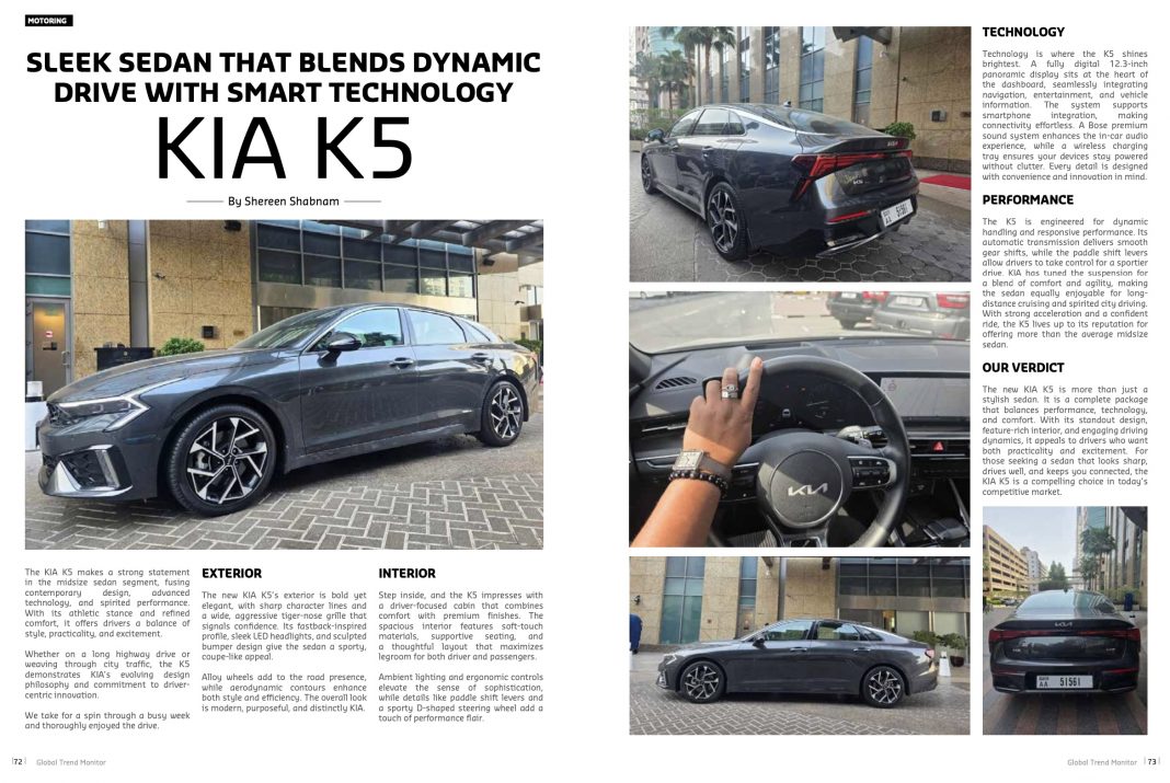 Motoring Sleek Sedan That Blends Dynamic Drive with Smart Technology: KIA K5 By: admin Date: September 1, 2025 Share: FacebookTwitterPinterestWhatsApp Sleek Sedan That Blends Dynamic Drive with Smart Technology: KIA K5 TagsAutomotiveCars of 2025Drive KIAGlobal Trend MonitorKIA K5MotoringShereen Behind The WheelsShereen ShabnamSleek SedanTest Drive admin Share FacebookTwitterPinterestWhatsApp ━ more like this Motoring Mille Miglia UAE: Where Heritage, Emotion, and Automotive Art Come Alive December 4, 2025 Returning to “The Most Beautiful Race in the World” Motoring Bold, Smart, and Built for Modern Adventures: 2026 Ford Territory October 5, 2025 Previous articleEngineering Dreams, Building Empires: The Entrepreneurial Spark of Milo BorissovNext articleDesigning the Future: Taewook Choi’s Vision of the All-New Hyundai Santa Fe